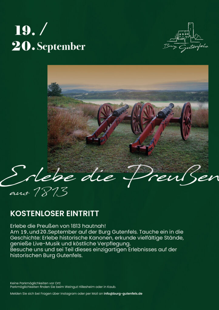 Am 19. und 20. September auf der Burg Gutenfels. Tauche ein in die Geschichte: Erlebe historische Kanonen, erkunde vielfältige Stände, genieße Live-Musik und köstliche Verpflegung.